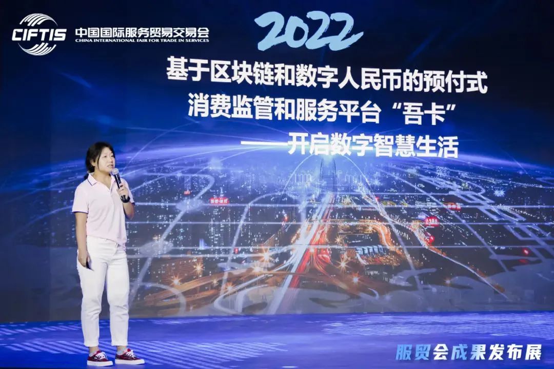神州方圆副总经理肇熙出席成果发布展,向大家介绍“吾卡”预付式消费监管和服务平台,平台通过探索区块链技术和数字人民币应用,将消费者、商户、金融机构、监管各方都纳入生态,实现基于区块链的各方数据共享、同步及存证,解决退款难、追偿难、维权难等痛点,开启全新、安全的可信消费新模式。
