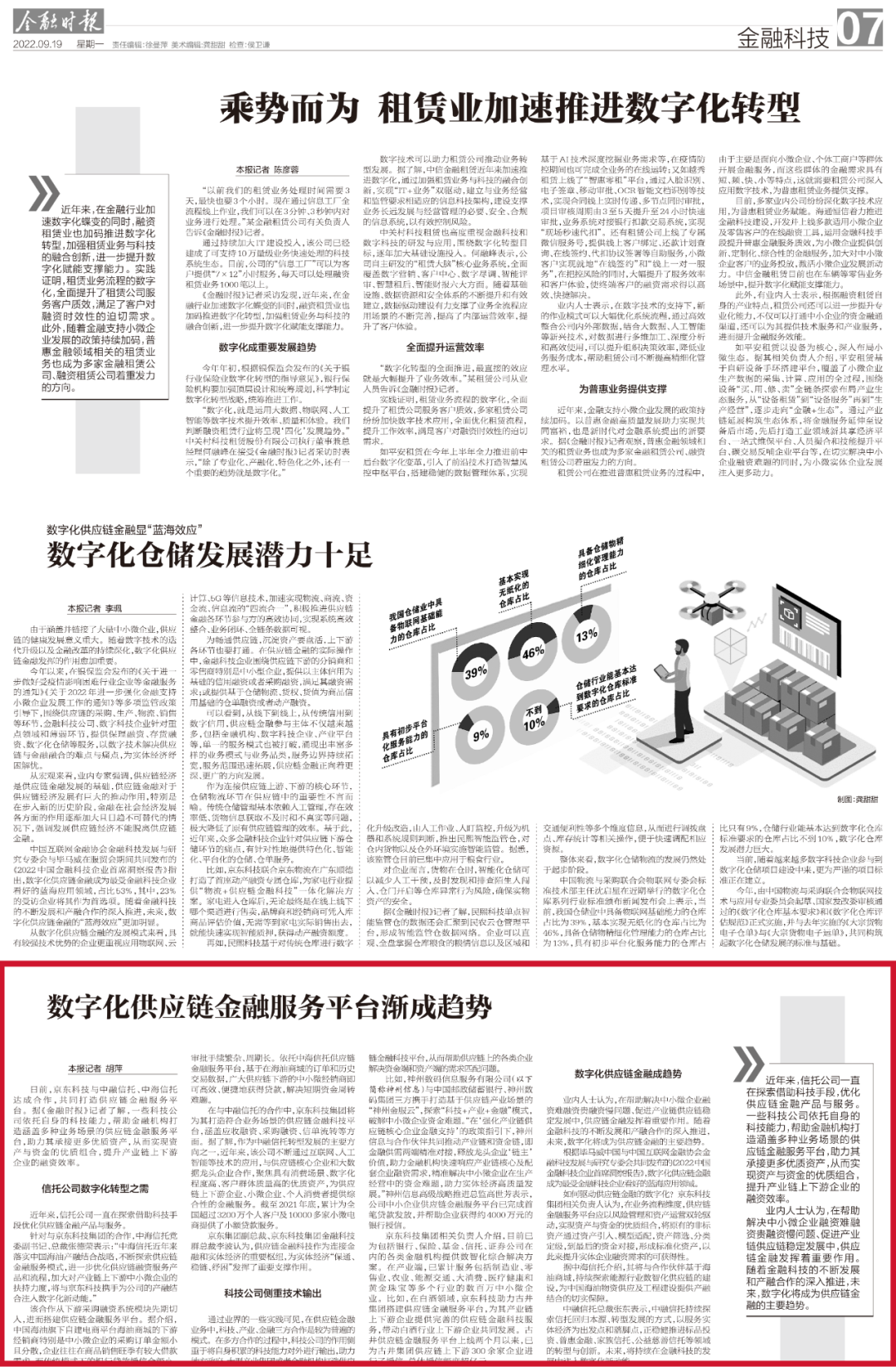 据《金融时报》记者了解,一些科技公司依托自身的科技能力,帮助金融机构打造涵盖多种业务场景的供应链金融服务平台,助力其承接更多优质资产,从而实现资产与资金的优质组合,提升产业链上下游企业的融资效率。
